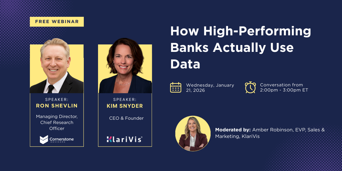 In this webinar, Ron Shevlin, Managing Director & Chief Research Officer at Cornerstone Advisors, and KlariVis CEO & Founder Kim Snyder tackle a problem every community bank faces: we’ve invested in the tools, our people are hungry for insights, but nobody knows what to actually do with all this data once we have it.